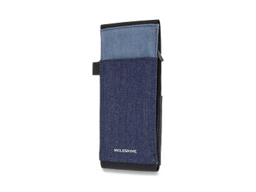 Multifunkční pouzdro, které se nasazuje na desky zápisníku. Pojme dvě až tři psací potřeby, do kapsy na zip bezpečně uložíte mobil či jiné důležité nezbytnosti, uvnitř desek je další malá kapsička na poznámky a vizitky. Kombinace barev černá a modrá, omyvatelná textilie. Určeno na zápisník o rozměrech A5 - 13x21 cm.