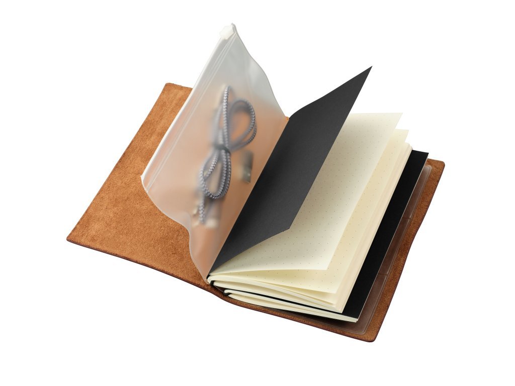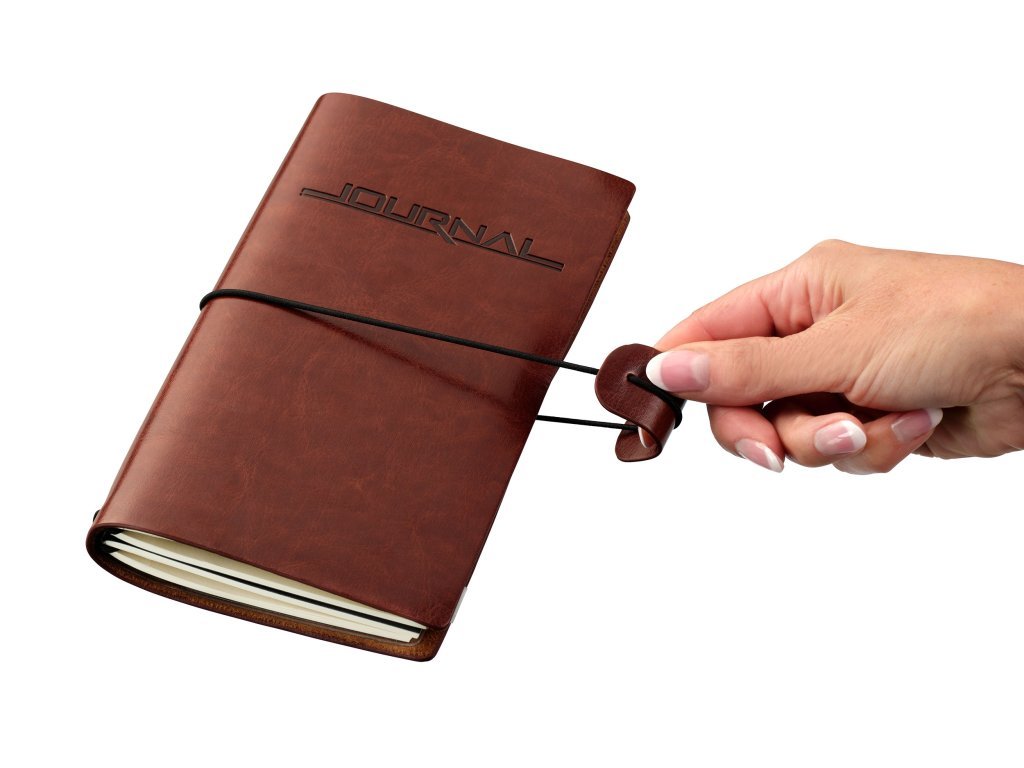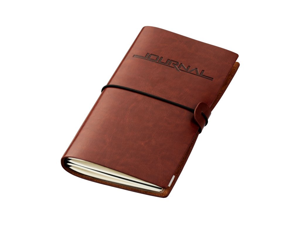 Bullet Journal sestávající ze 2 sešitů, velikost papíru 10 cm x 18,5 cm, v potahu z imitace kůže, s odnímatelnou a průhlednou vložkou organizéru, skládající se z velké, uzamykatelné přihrádky vpředu a tří přihrádek na organizaci karet vzadu, na sešit: 36 perforovaných listů (72 stran), papír s certifikací FSC, tečkovaná mřížka, uchycený gumičkami (lze znovu naplnit), na obálce vyražené „JOURNAL“, zapínání na gumičku s poutkem na pero, PVC / imitace kůže / velur, hnědá