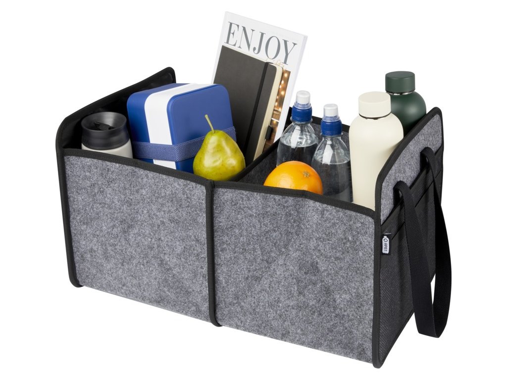 Ideální pro uložení nabíjecích kabelů vašeho elektromobilu, přenášení vašich nákupů nebo jen pro udržení pořádku ve vašem autě nebo domově. Složí se na místo bez námahy a elastický pásek zajistí, že zůstane úhledně složený. Hloubka při uzavření: 4,5 cm. Hloubka při otevření: 48 cm. GRS certified recycled polyester.