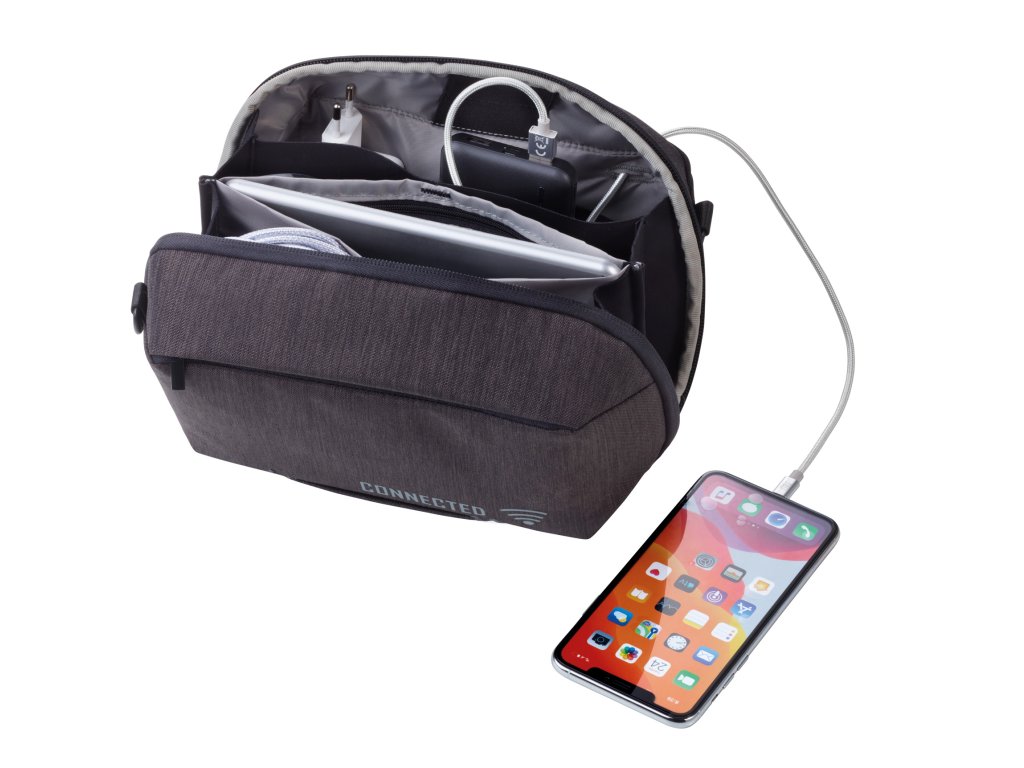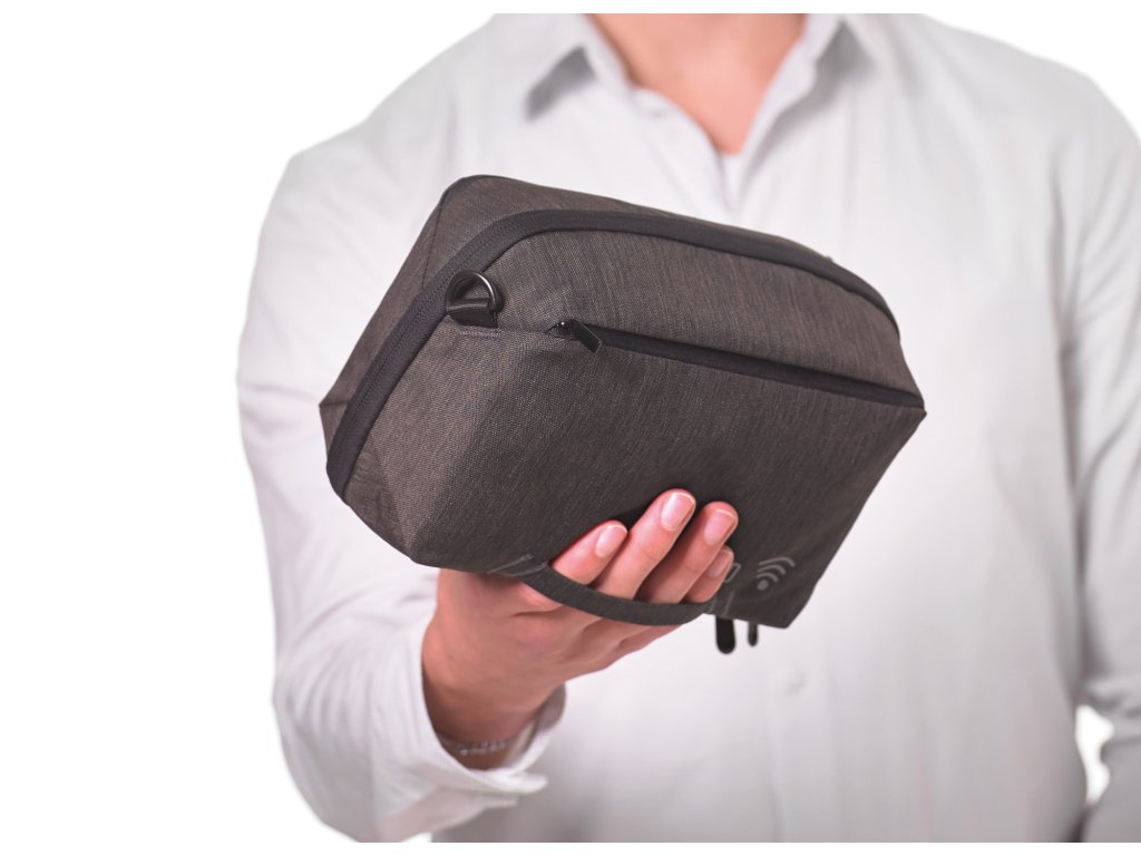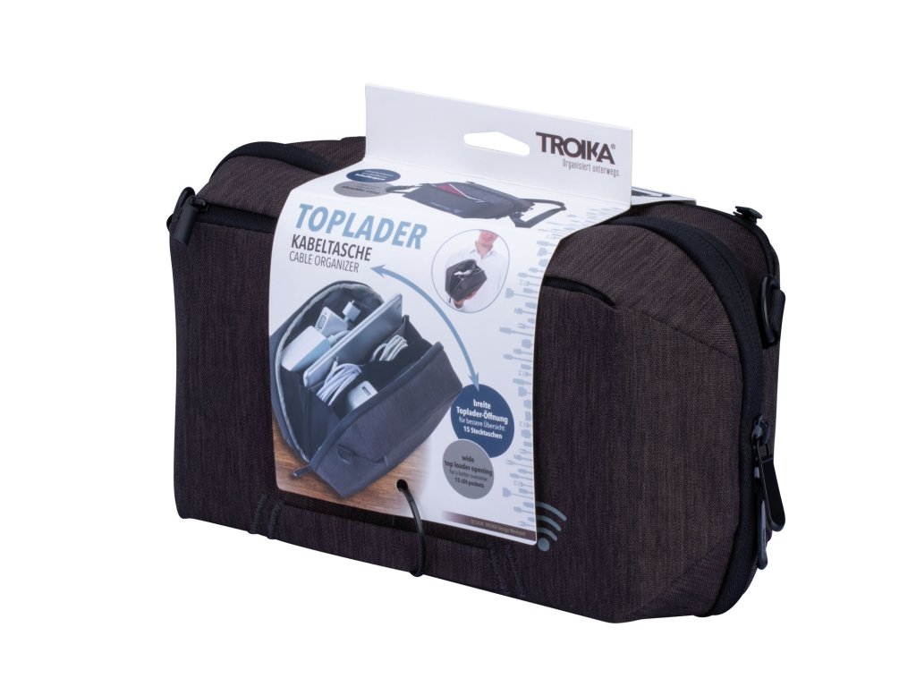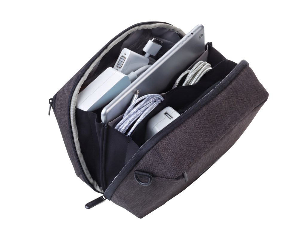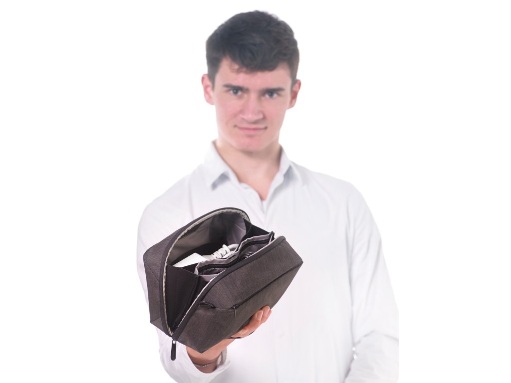 Kabelová taška na příslušenství elektroniky s bočními uchy, velká hlavní přihrádka, široký otvor pro horní plnění pro lepší přehled: 15 kapes, elastické pásky + přídavná přihrádka na zip, 4 poutka na pera, 2 vnější přihrádky, 1 x s otvorem pro nabíjecí kabel.