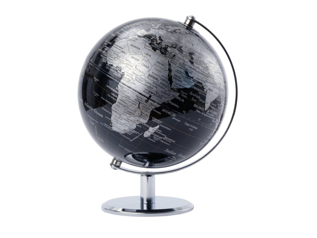 Zeměkoule průměr 20 cm, pochromovaná kovová základna, pohyblivá osa, plast/kov, lesklá, černá/stříbrná