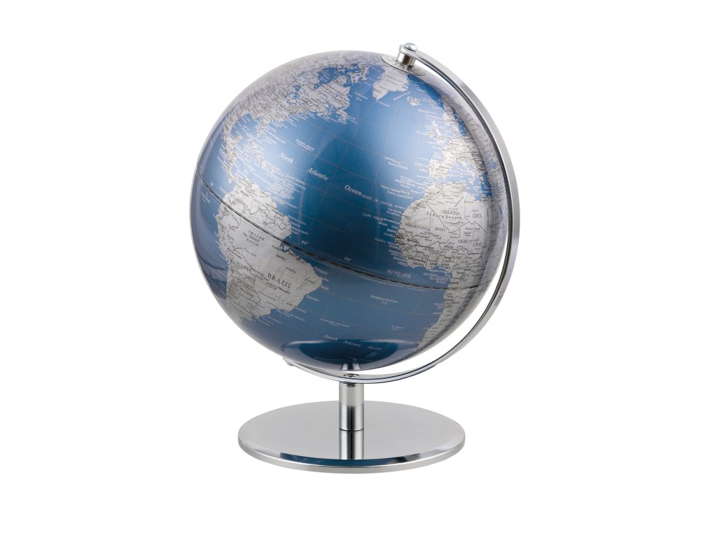 Glóbus o průměru 25 cm, chromovaná kovová základna, pohyblivá osa, plast/kov, lesklá, modrá/stříbrná