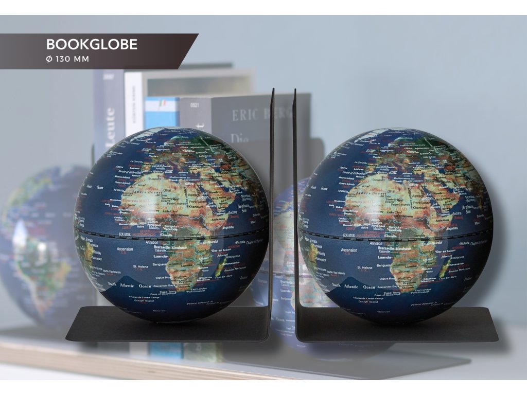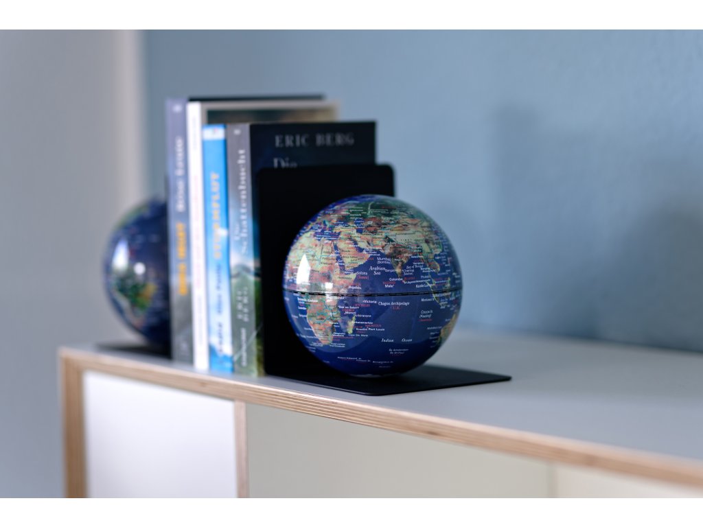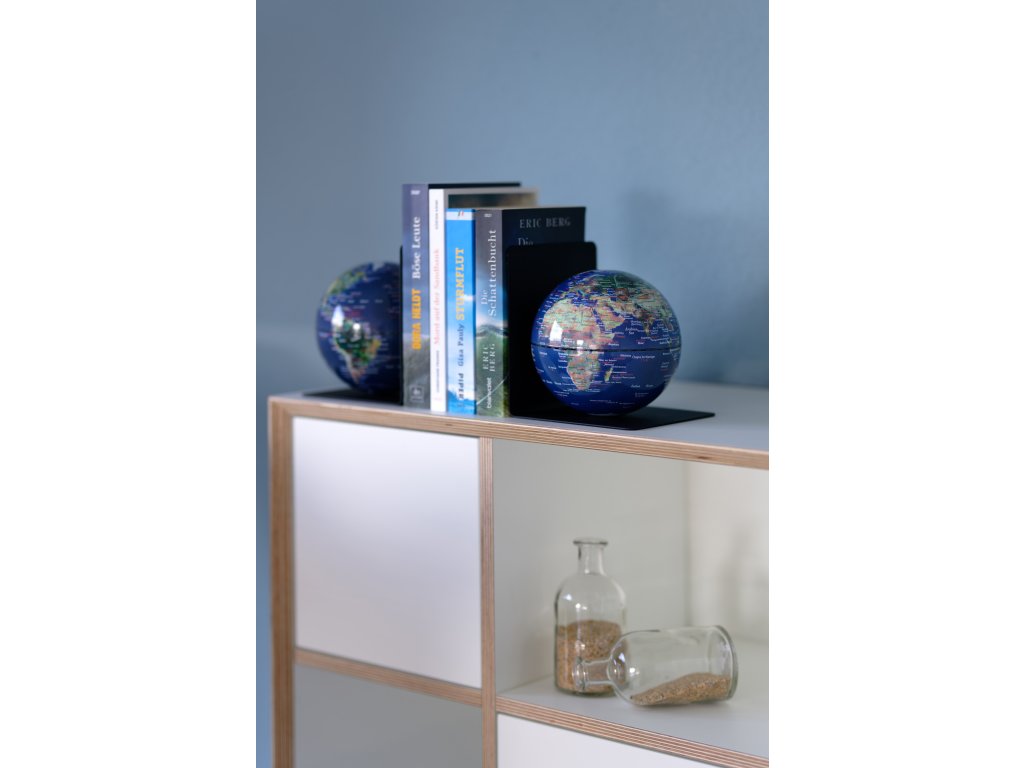 Ať už jde o Goetha, Shakespeara nebo kuchařky - nejlépe jim bude mezi dvojicí BOOKGLOBE. Fixace pomocí magnetu umožňuje glóby snadno vyjmout a pohodlně si je prohlédnout. Zarážky na knihy jsou vyrobeny z matně černého kovu a mají výšku 15,5 cm. Při umístění vedle sebe jsou široké 26 cm.