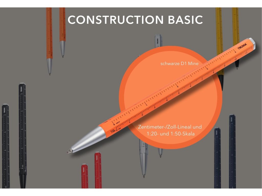 Klasická kvalita s černým vývodem D1 pro dlouhé a plynulé psaní. V typickém CONSTRUCTION vzhledu s centimetrovým/palcovým pravítkem a měřítkem 1:20 a 1:50. Hliník a matný kov. Multitaskingové kuličkové pero CONSTRUCTION BASIC kombinuje několik funkcí v jednom zařízení.