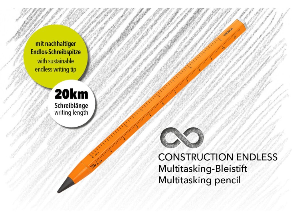Technika tužky byla předefinována. Už žádné ostření, žádné zlomené tuhy, místo toho: udržitelný nekonečný psací hrot v HB pro délku psaní až 20 km, vyměnitelný, mazatelný a nezlomitelný. V typickém CONSTRUCTION vzhledu s centimetrovým/palcovým pravítkem a měřítkem 1:20 a 1:50. Hliník a matný kov v oranžové barvě.