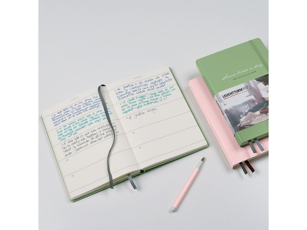 Pro zaznamenávání myšlenek a zážitků po dobu pěti let. Zápisník v tvrdé vazbě velikosti A5. Každá stránka uvádí měsíc a den a je rozdělena na 5 nelinkovaných sekcí, v každé z pěti sekcí se doplní poslední dvě číslice roku. Můžete tak zpětně porovnávat záznamy ze stejného dne jednotlivých roků. Papír bez obsahu kyselin v gramáži 80 g/m2.
