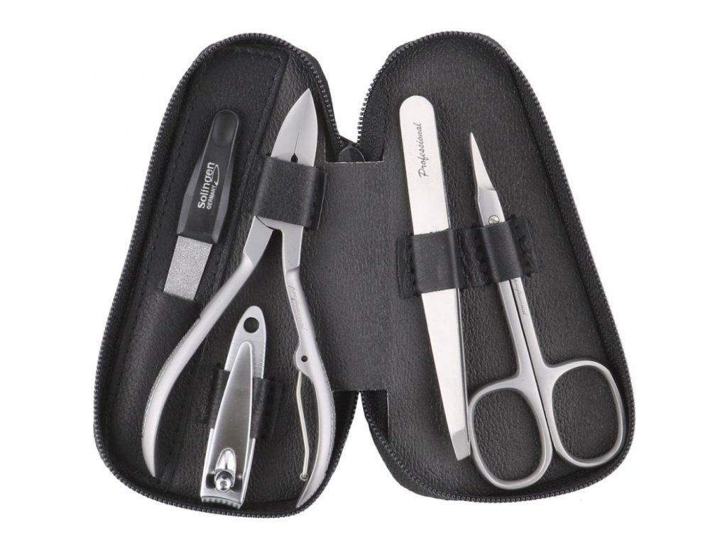 Pouzdro je vyrobeno z přírodní hovězí kůže v černé barvě a uzavírá se na zip. Uvnitř najdete 4 nástroje z nerezové oceli z řady Professional a safírový pilník Solingen.