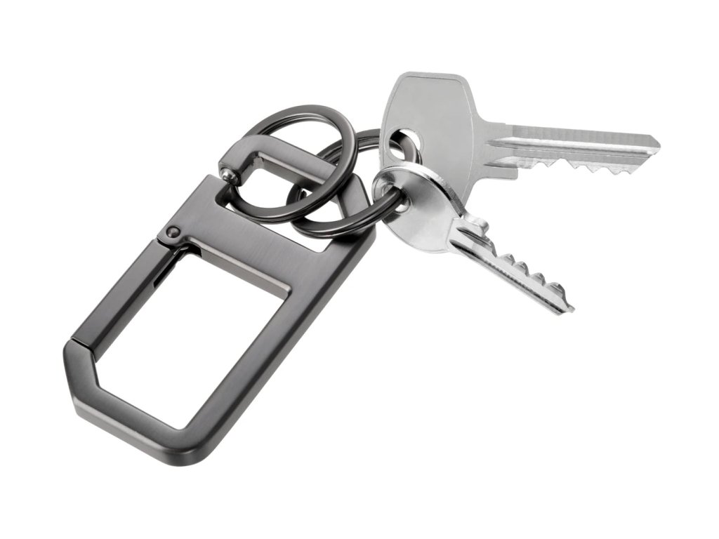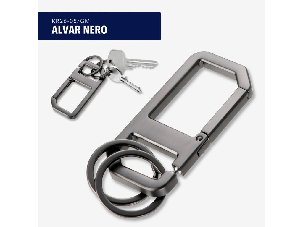 Klíčenka a karabina s praktickým zapínáním „cvak“, včetně dvou kroužků na klíče, tlakově litý kov, matná antracitová povrchová úprava. Snadné použití díky důmyslnému mechanismu kuličky – usnadňuje připevnění a odpojování kroužků na klíče – praktická karabina pro připevnění k poutku na opasek. ALVAR NERO kombinuje minimalistický design s chytrou mechanikou, ideální pro skutečné technické nadšence. Klíčenka – rychlá výměna komponentů díky mechanismu kuličky – bezpečné uchycení klíče díky mechanismu kuličky. Připevněno k vysoce kvalitnímu kroužku na klíče – takže se neztratí ani klíčenky, ani svazky na klíče. Lesklý litý kov v šedé barvě.