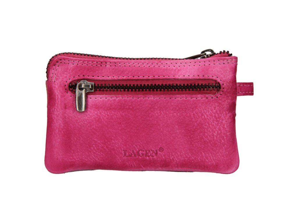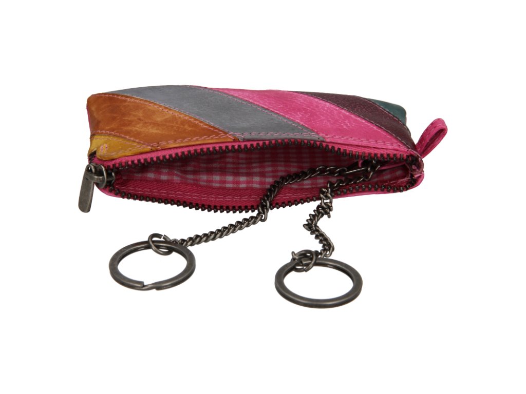 Obsahuje dvě přihrádky na zip a dva kroužky na klíče.