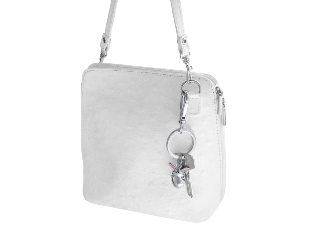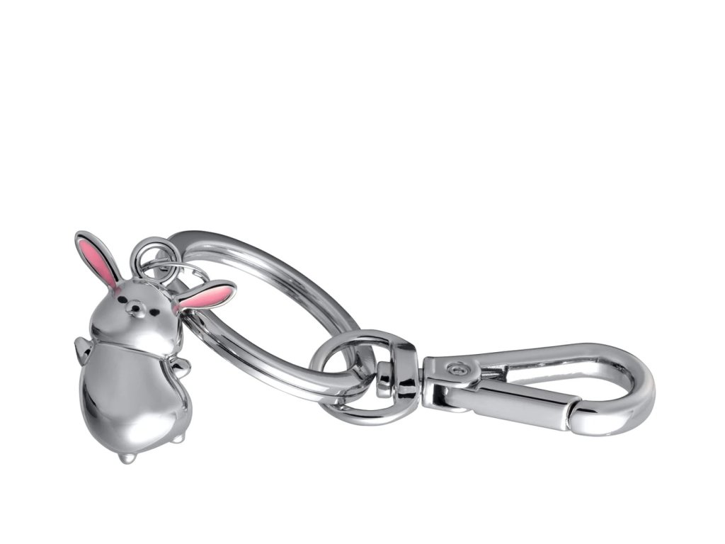 Přívěsek/klíčenka na tašku s karabinou, malý králíček, litý kov, chromovaný, lesklý, stříbrná barva