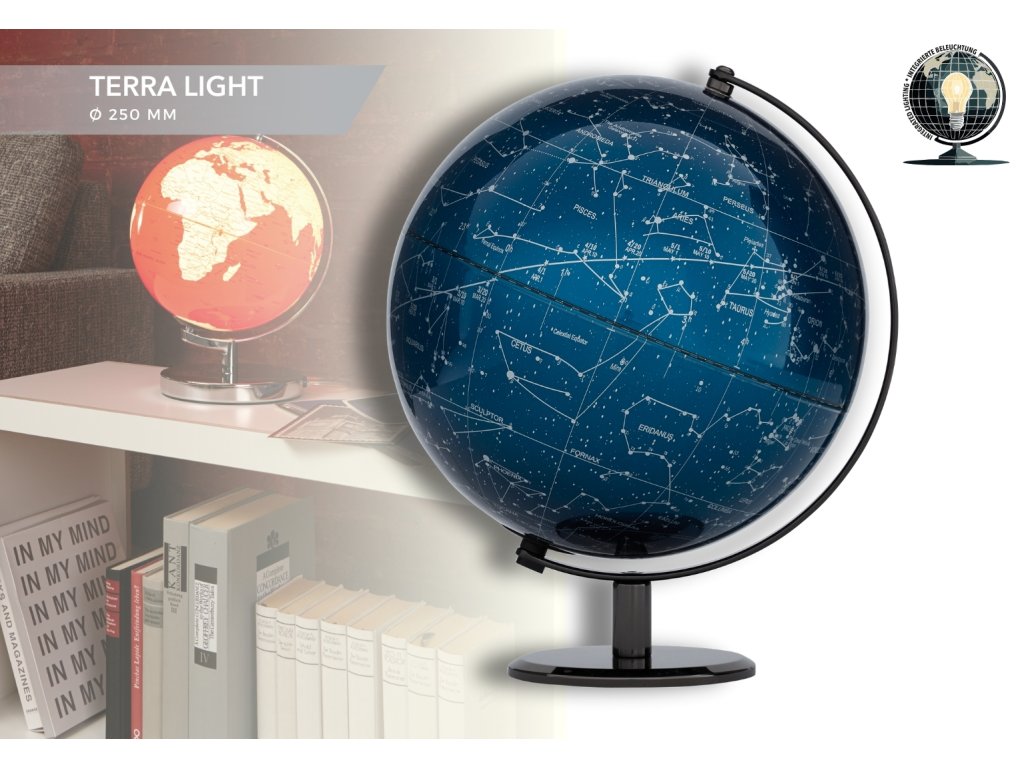 Atraktivní design: LED globus TERRA LIGHT (průměr 25 cm) s motivem souhvězdí, modré galaxie a stříbrných hvězd. Zeměkoule je označena v angličtině a zobrazuje všech 12 znamení zvěrokruhu.
