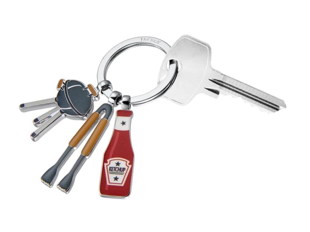 Klíčenka se 3 přívěsky: lahev kečupu, gril, kleště, smalt, tlakově litý kov, potištěný, chromovaný, lesklý, šedočervený