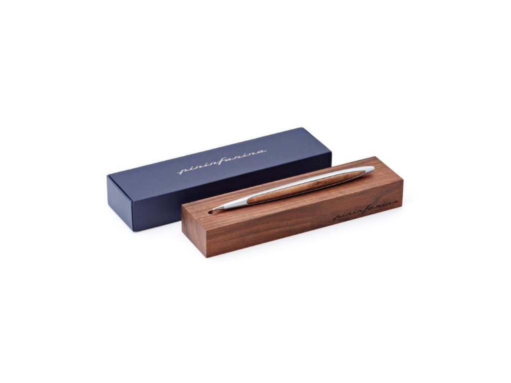 Dřevo v dekoru tmavého ořechu. Vyražené logo společnosti Pininfarina na přední straně stojánku a levé straně pera.
