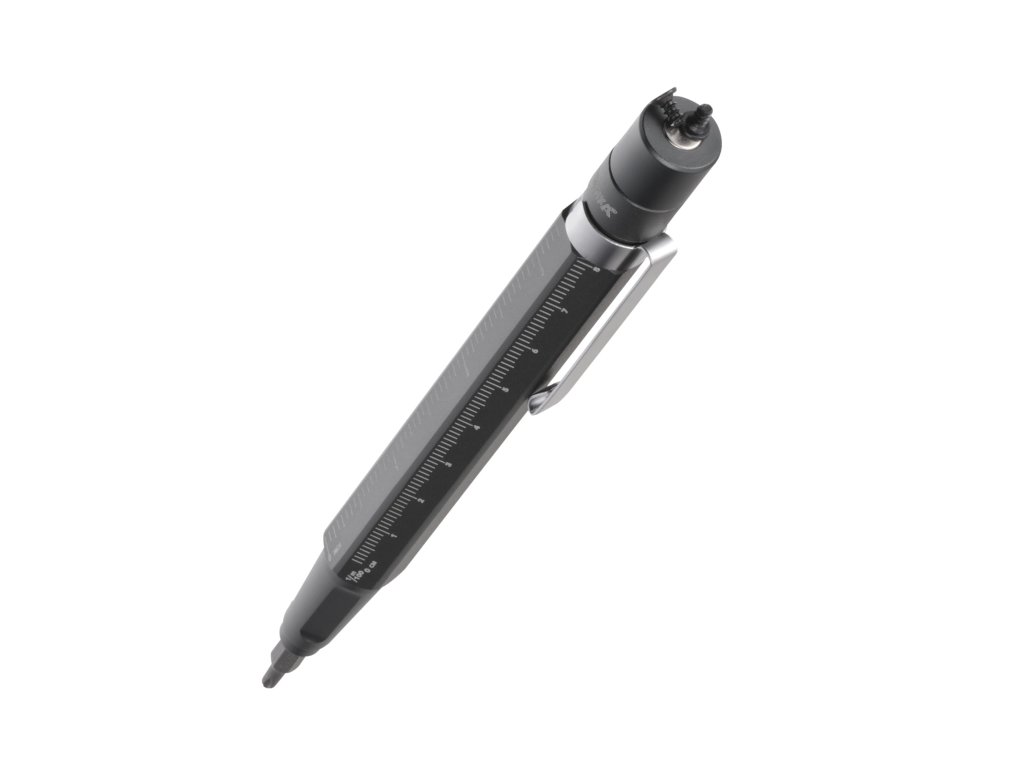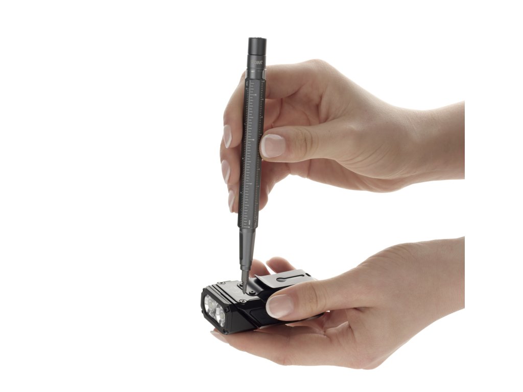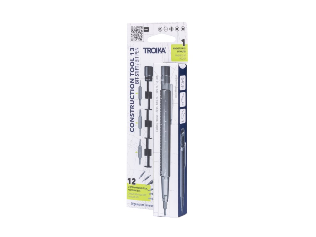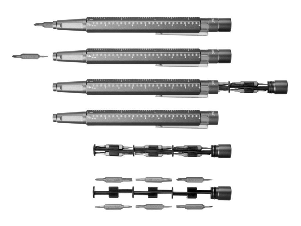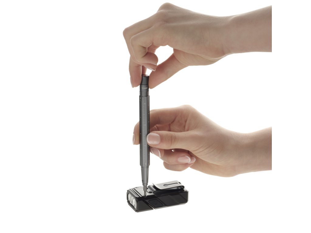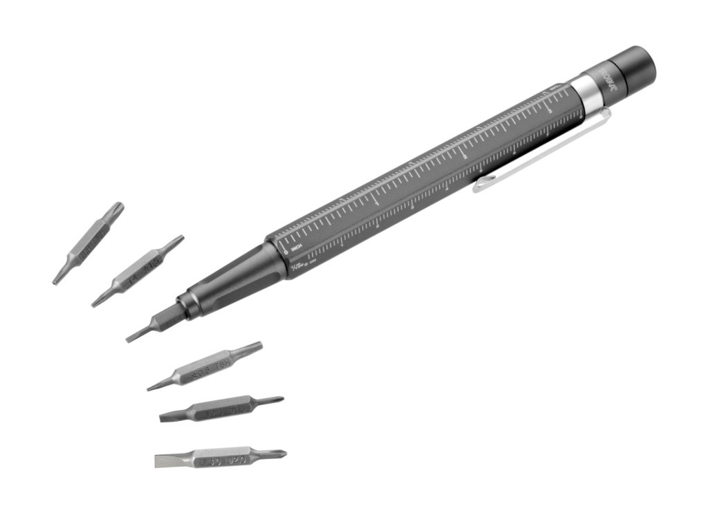 Bitové pero s 12 různými přesnými bity, prostorově úsporné uložení uvnitř tělesa, magnetický hrot pro bezpečné upevnění bitů, obsahuje speciální bity pro zařízení Apple® a standardní bity pro běžné opravy v domácnosti, jako jsou kuchyňské váhy, LED světelné řetězy, dálkové ovladače atd., integrovaná magnetizační funkce na konci pera pro snadné uchopení šroubů a bitů, s klipem a centimetrovým/palcovým pravítkem, měřítko 1:20/1:50, hliník, chrom-vanadová ocel, matná, titanová barva