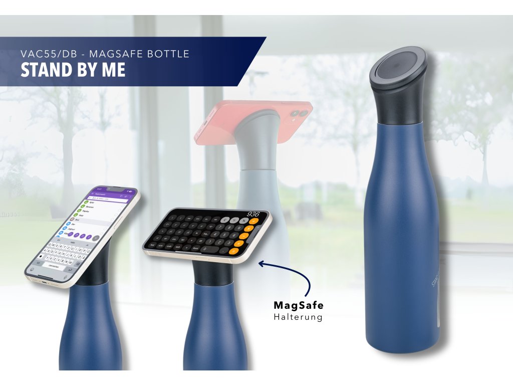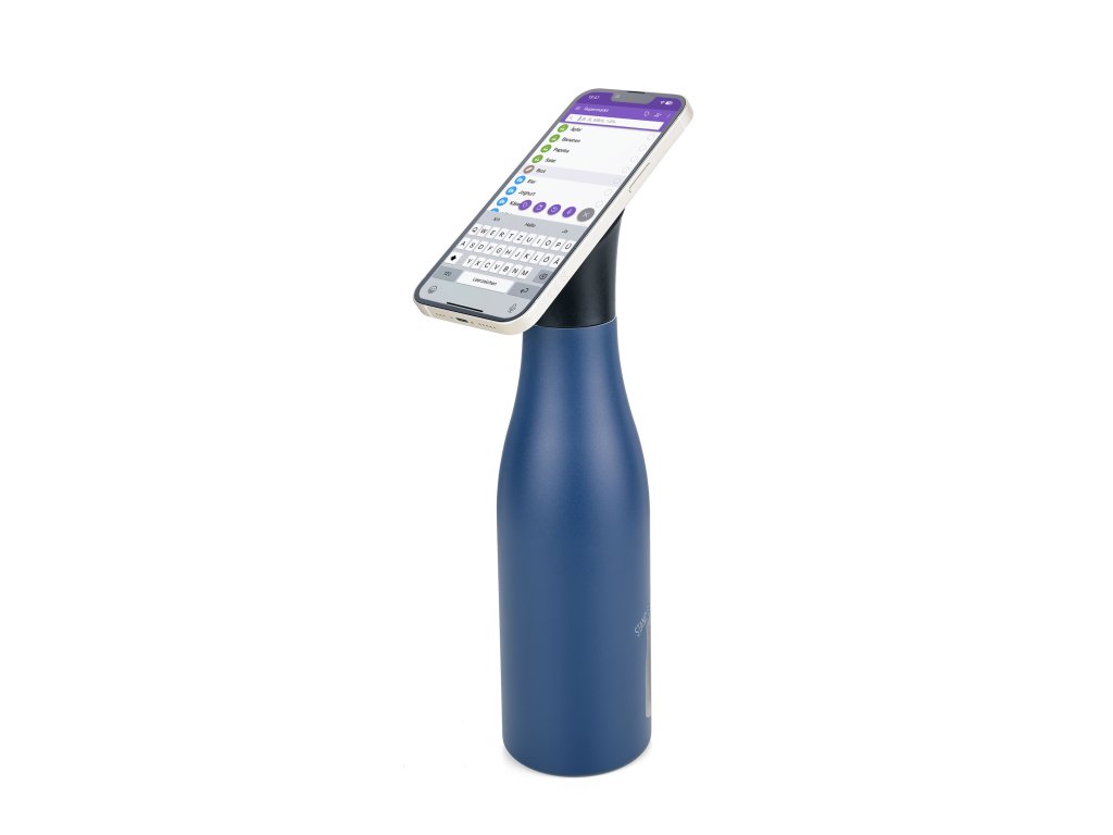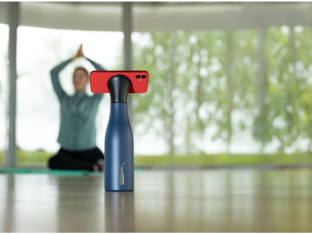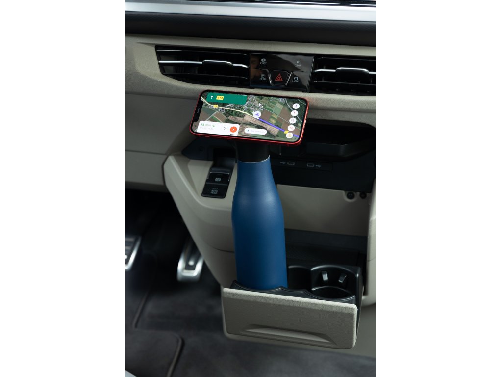 Inovativní design 2 v 1 - Magnetický, zkosený uzávěr slouží nejen jako bezpečné víko, ale také jako praktický držák na mobilní telefon na cesty.