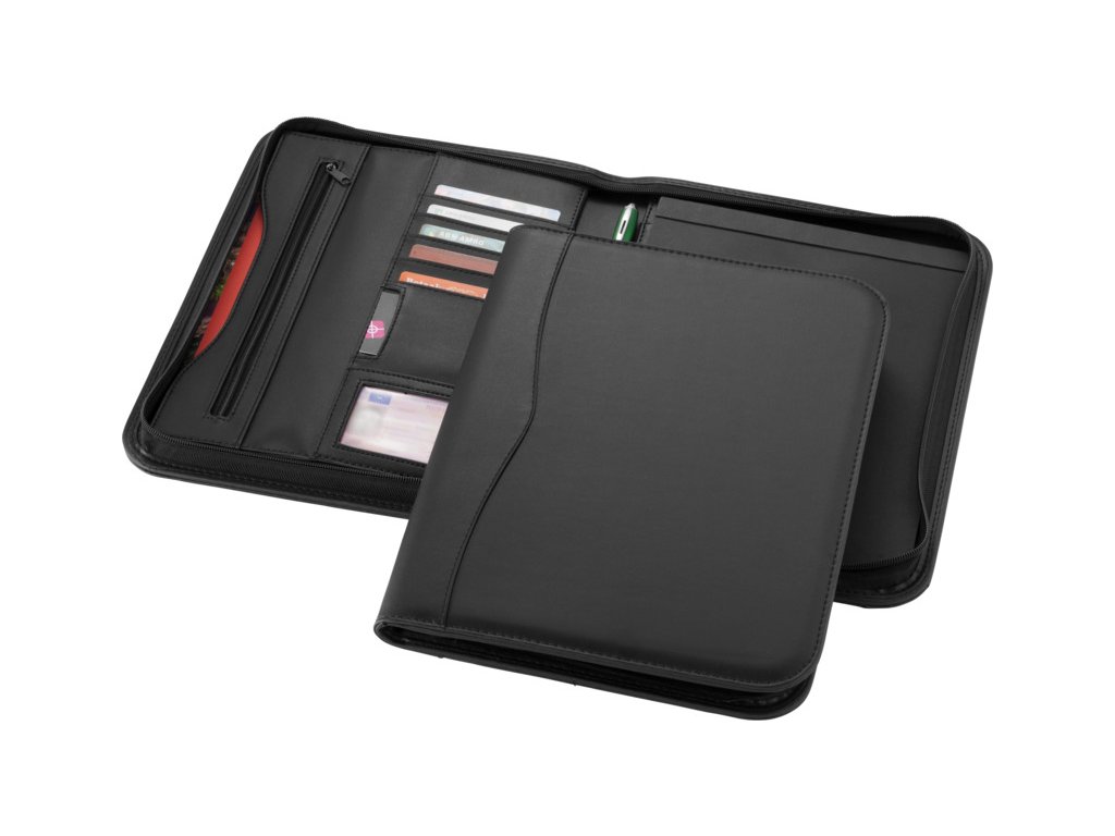 Portfolio o velikosti A4 obsahuje praktickou přihrádku a navíc kapsu na zip pro uložení dokumentů. Vedle toho má 20stránkový linkovaný poznámkový blok plus poutko na pero (pero a příslušenství nejsou součástí balení). Portfolio uzavřete zipem, aby byl obsah přehledný a dobře chráněný. Portfolio je vyrobeno z odolné imitace kůže.