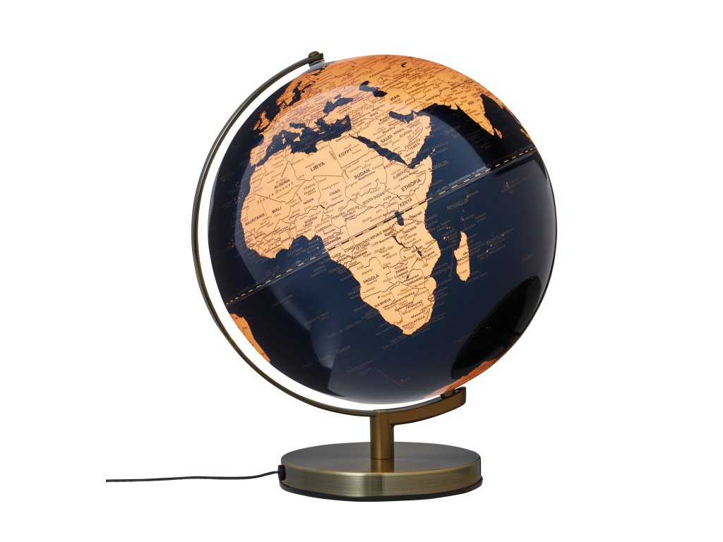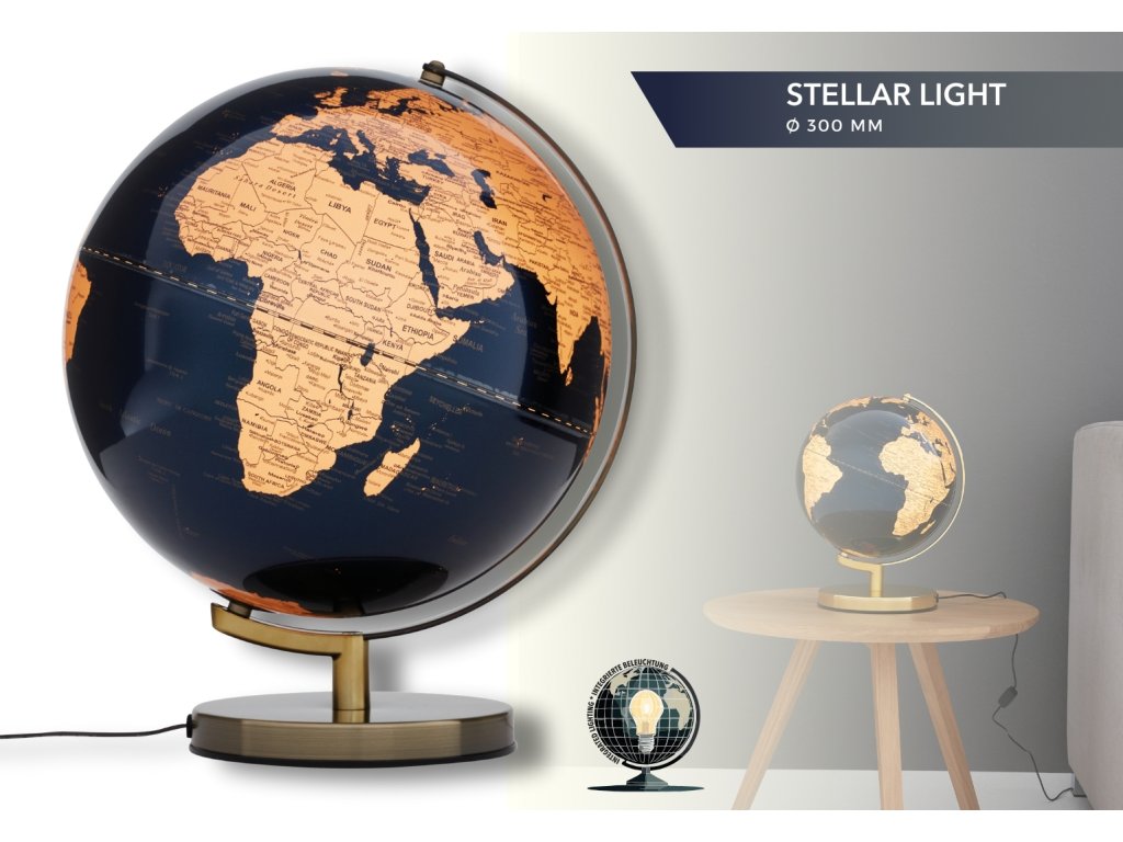 Svět vám tedy leží u nohou: Globus 300 x 380 milimetrů STELLAR LIGHT spolehlivě zajistí touhu po toulkách a na přání ukáže naši planetu v atmosférickém LED osvětlení. Mezi další elegantní detaily patří vysoce kvalitní chromovaný kovový rám a černý kabel s Euro zástrčkou a vypínačem. Všechny kontinenty, oceány, země a města jsou označeny v angličtině.
