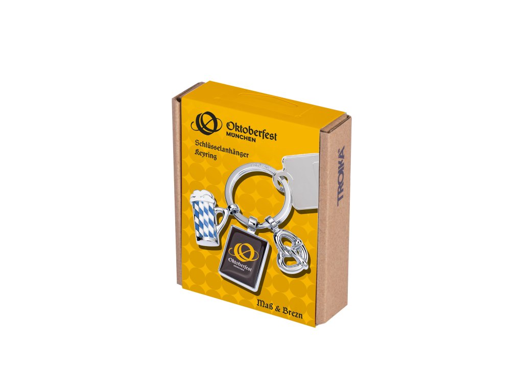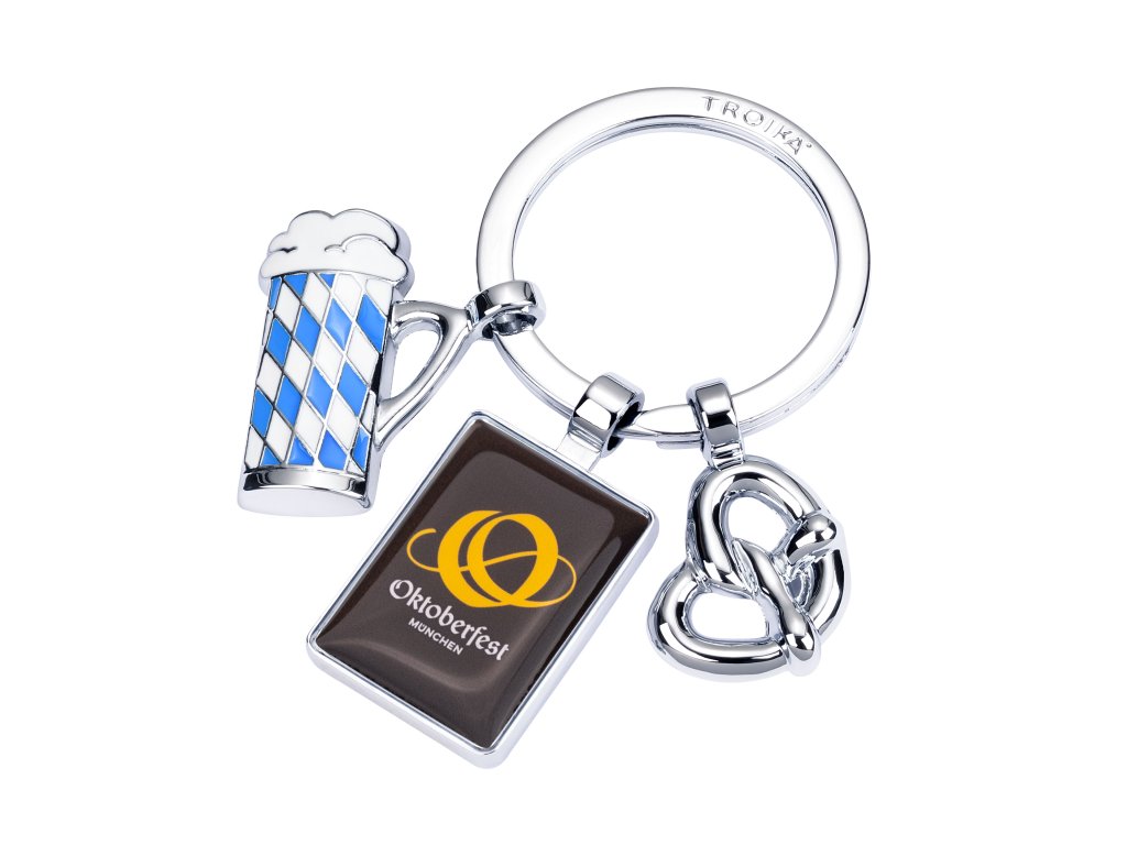 Klíčenka s motivem 3 přívěsků: OKTOBERFEST, korbel piva, preclík a logo Oktoberfestu, litý kov, lesklý, vícebarevný / stříbrný